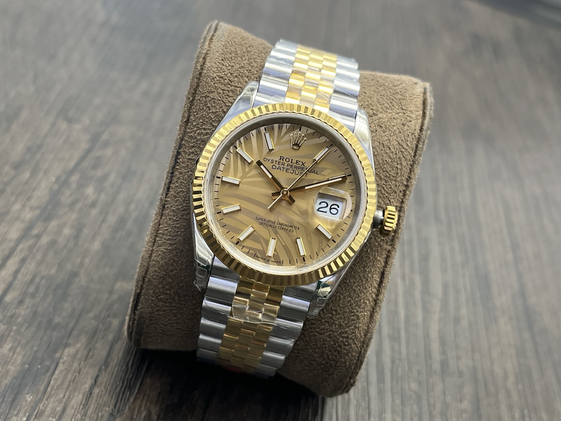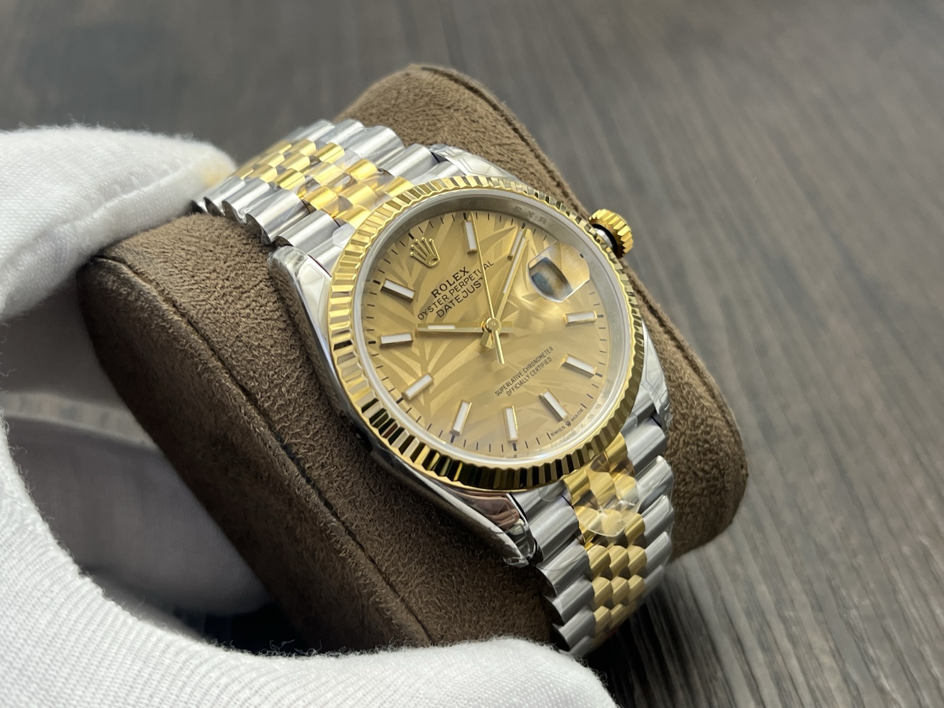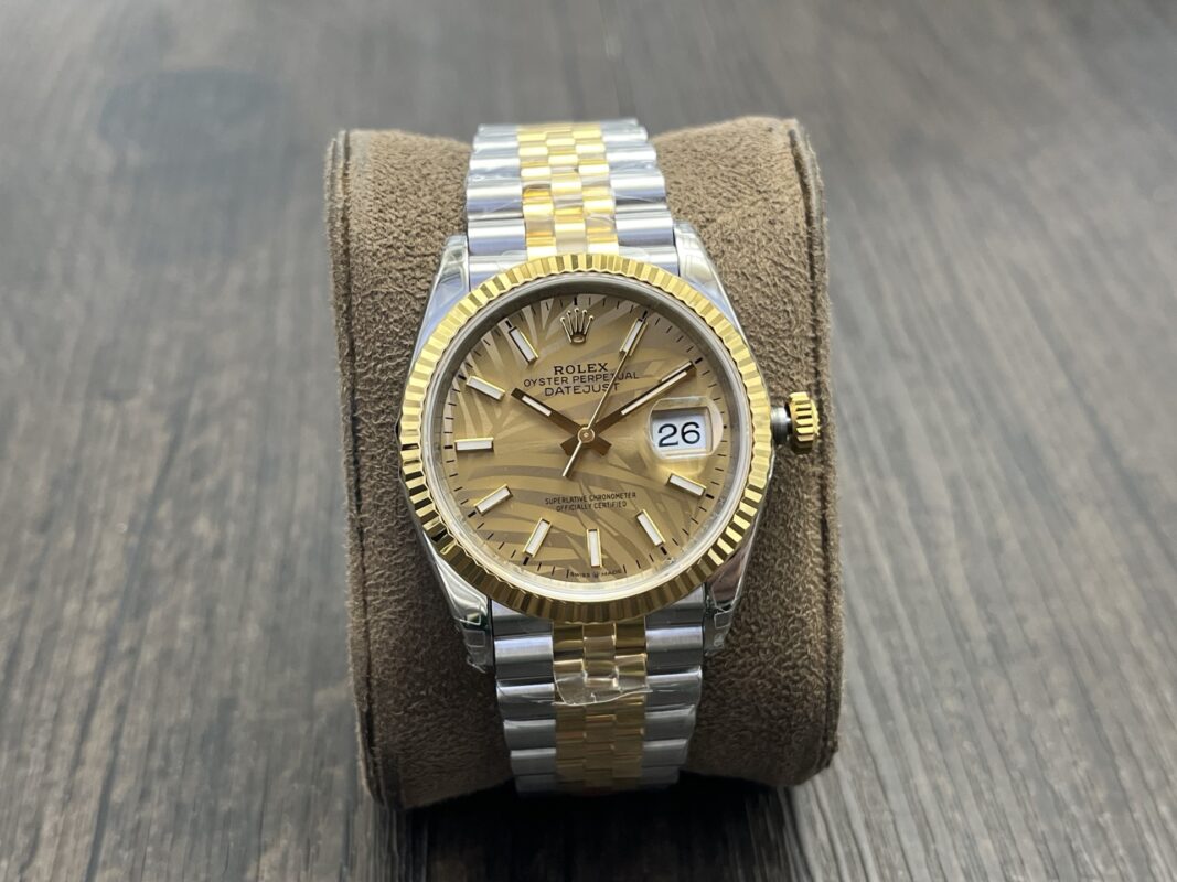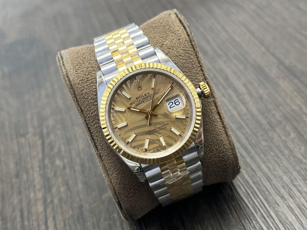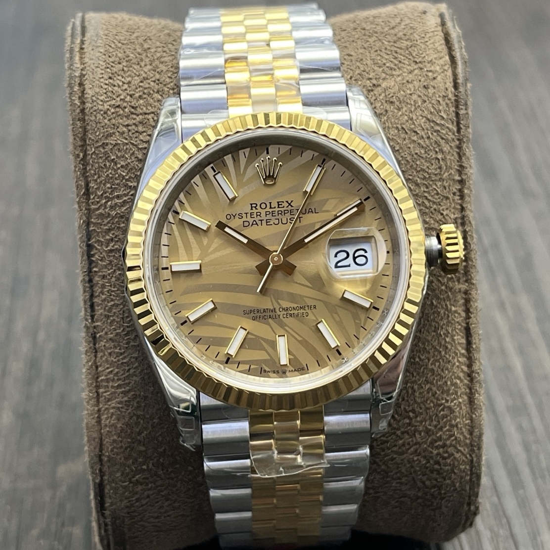 DIAL COLOR:Gold Palm Motif Dial Stick Markers(Blue Superlume Applied on Hands and Markers)