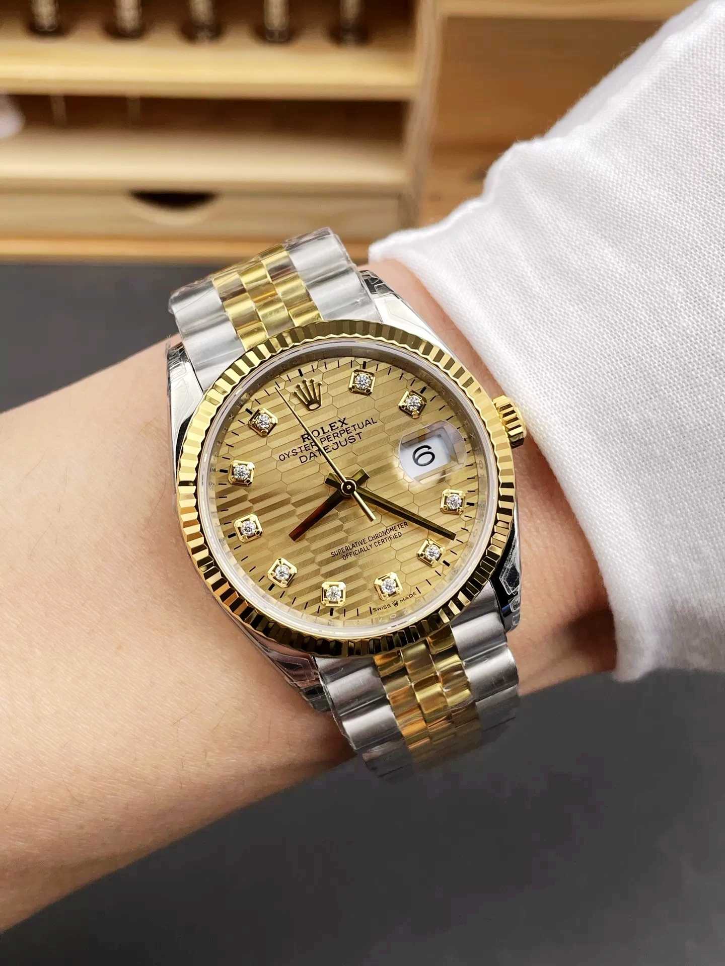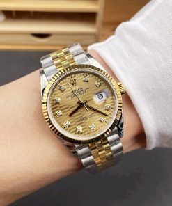 DIAL COLOR:Gold Textured Dial with Diamond Markers (Blue Superlume Applied on Hands and Markers)