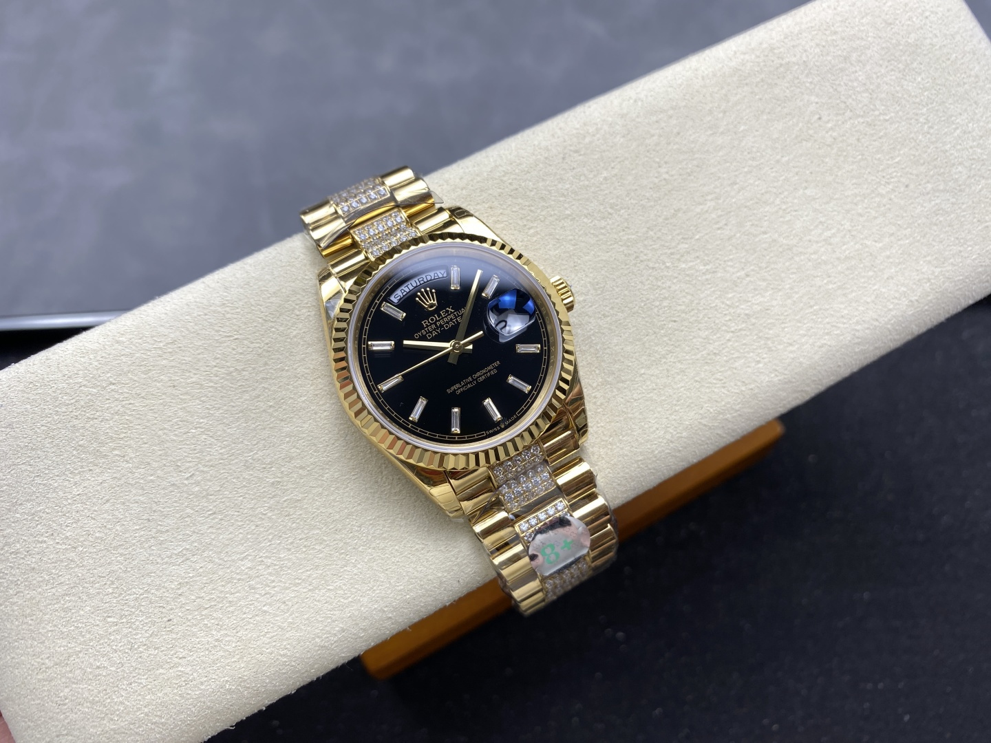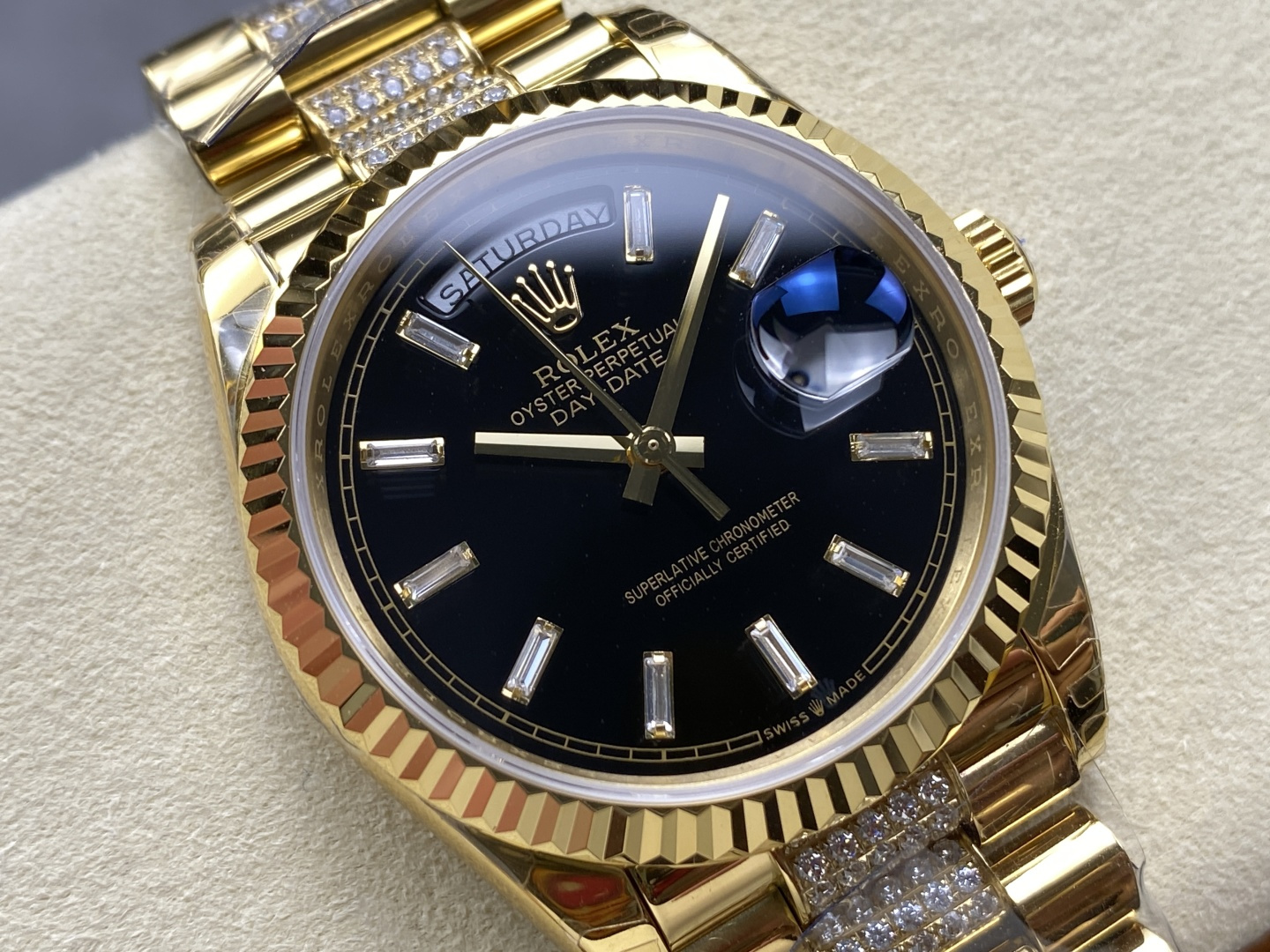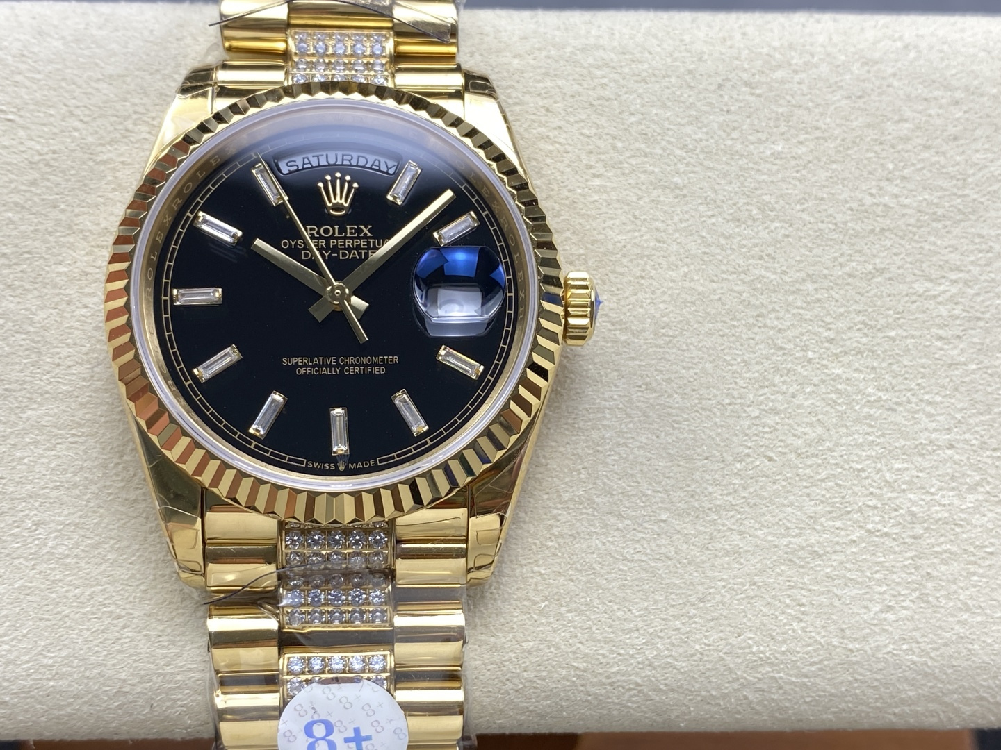 Rolex-DayDate 128238 36mm President Yellow Gold/Yellow Gold Black Dial Baguette Markers 8+F VR3255 Automatic