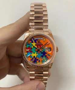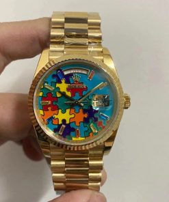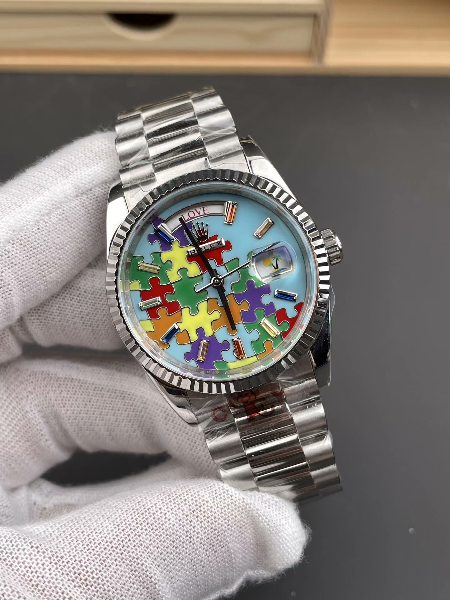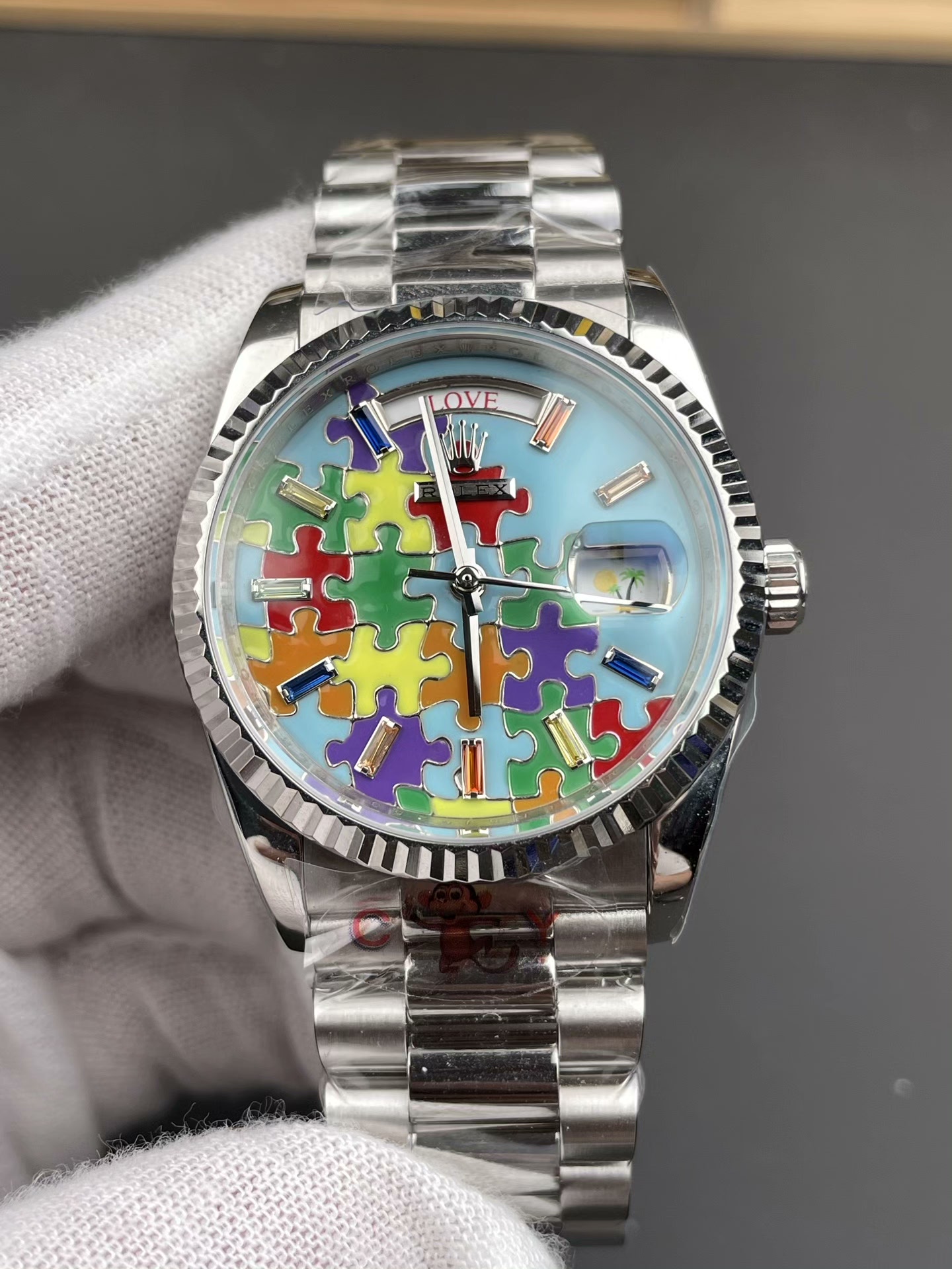 DIAL COLOR: “Jigsaw Puzzle” Dial, eaturing a turquoise blue dial with multi-colored puzzle pieces, baguette-cut sapphire hour markers, and an emoji display for the date.