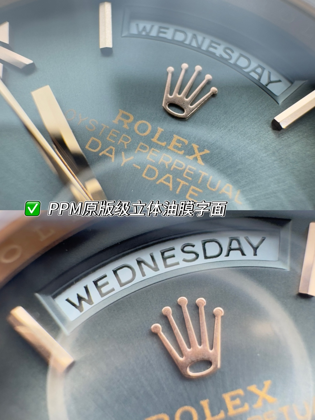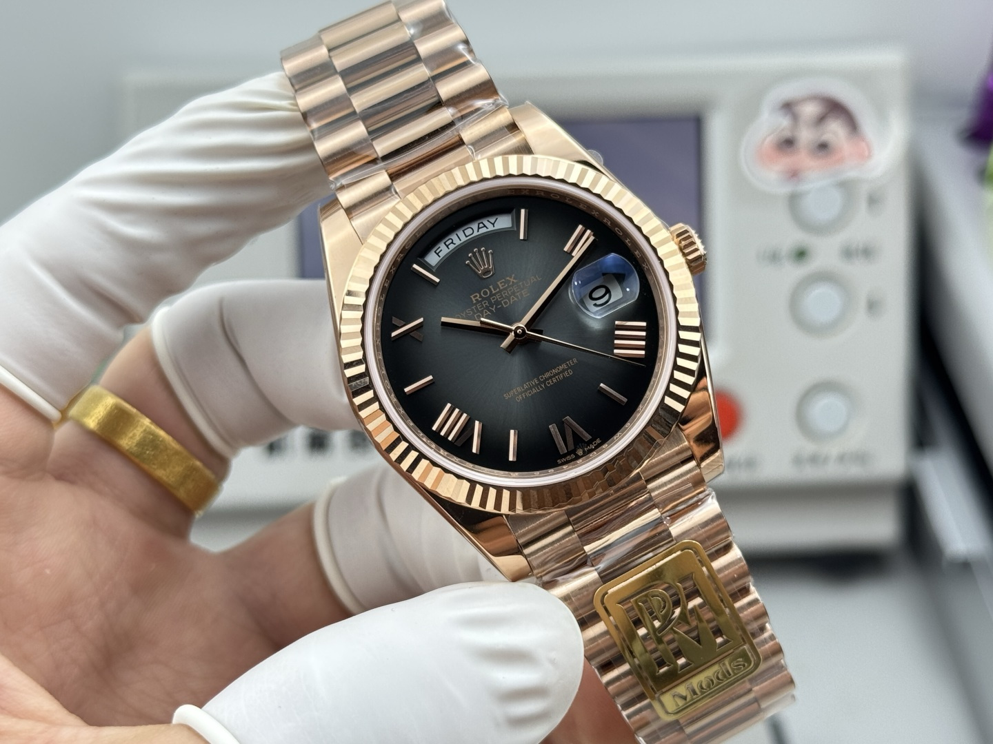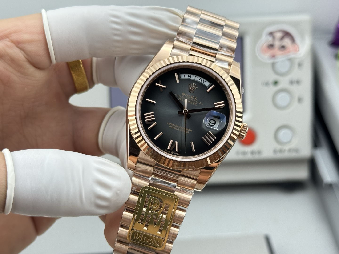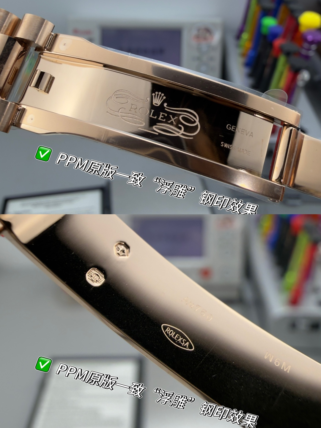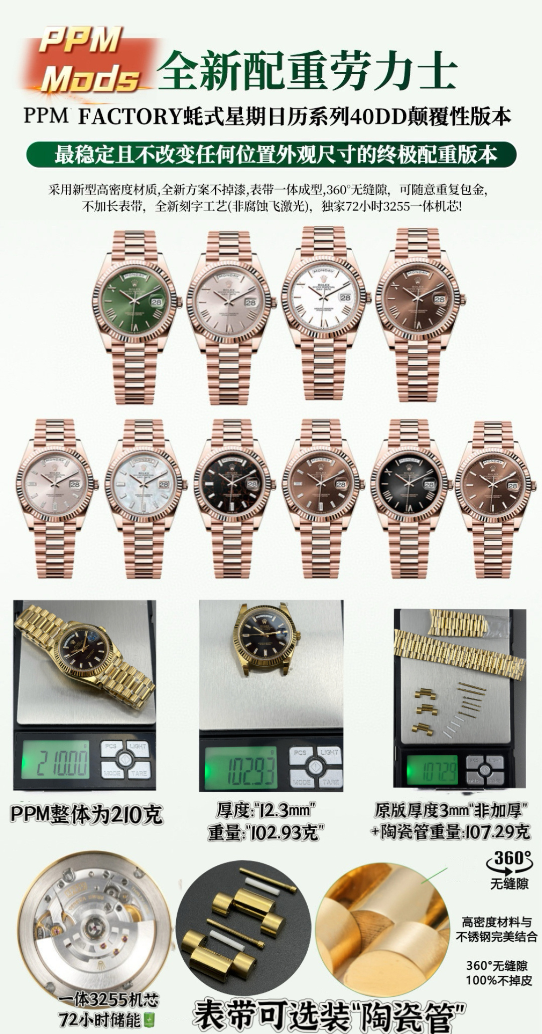The PPM factory has launched this disruptive version of the Day-Date 40mm watch, implementing an ultimate weight-balancing solution that achieves a weight experience extremely close to the original without altering any external dimensions.