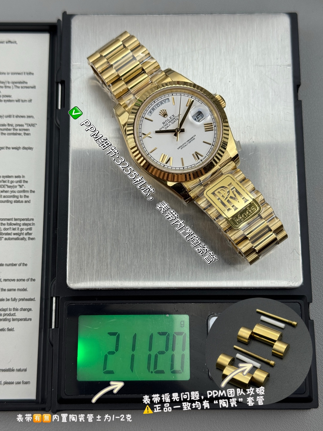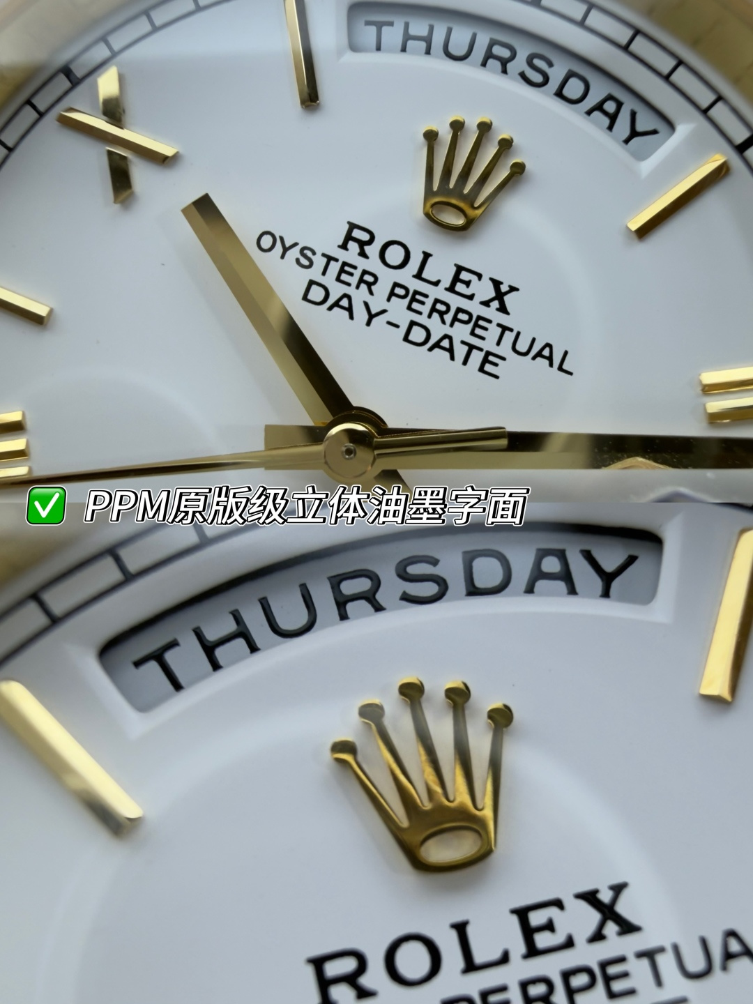The PPM factory has launched this disruptive version of the Day-Date 40mm watch, implementing an ultimate weight-balancing solution that achieves a weight experience extremely close to the original without altering any external dimensions.