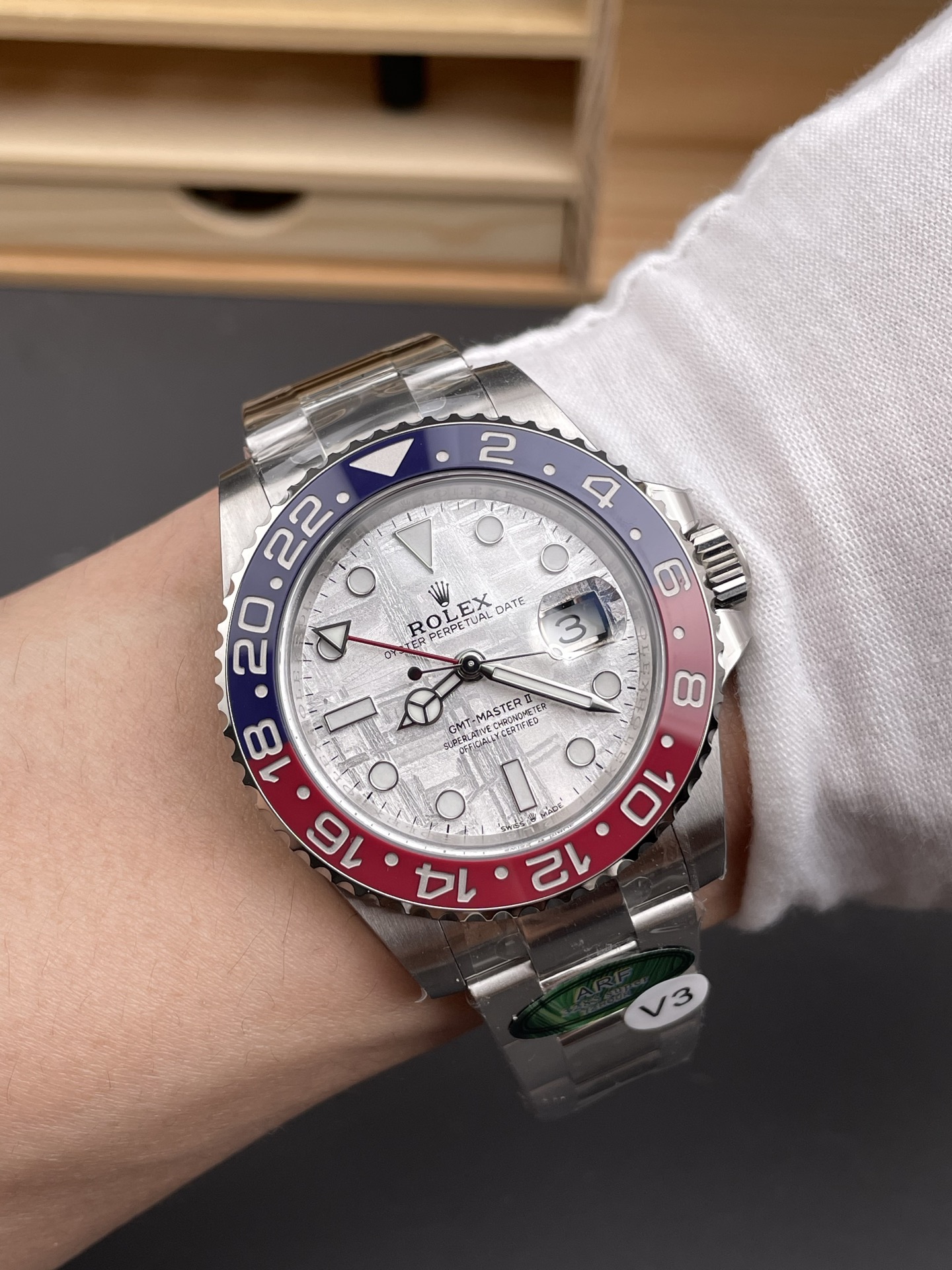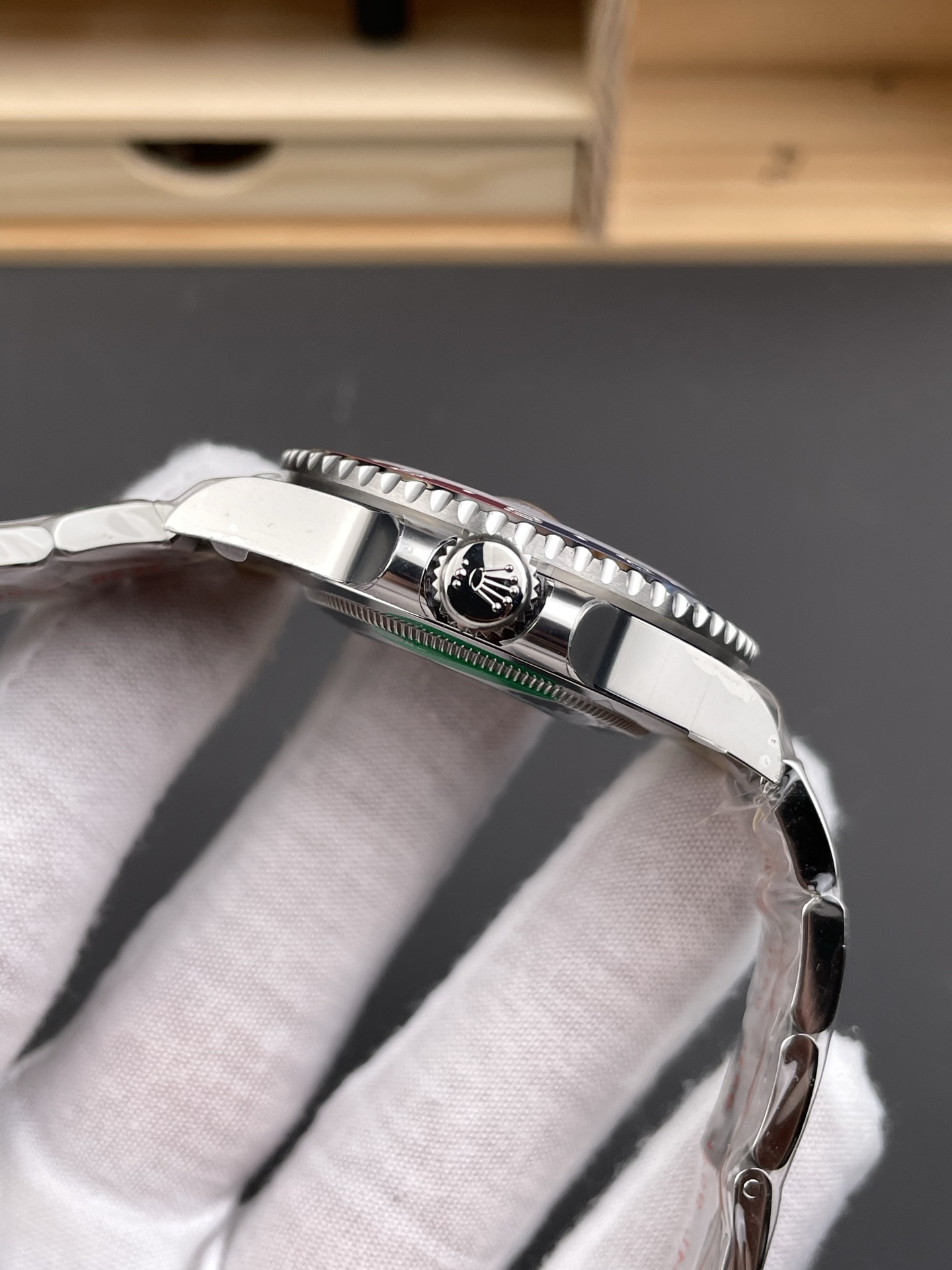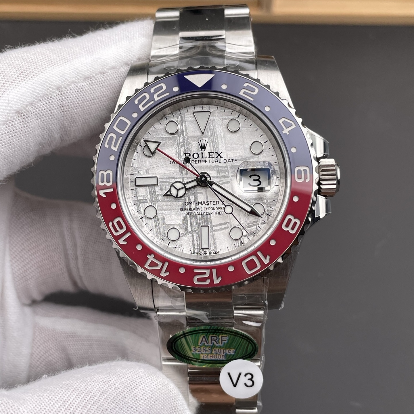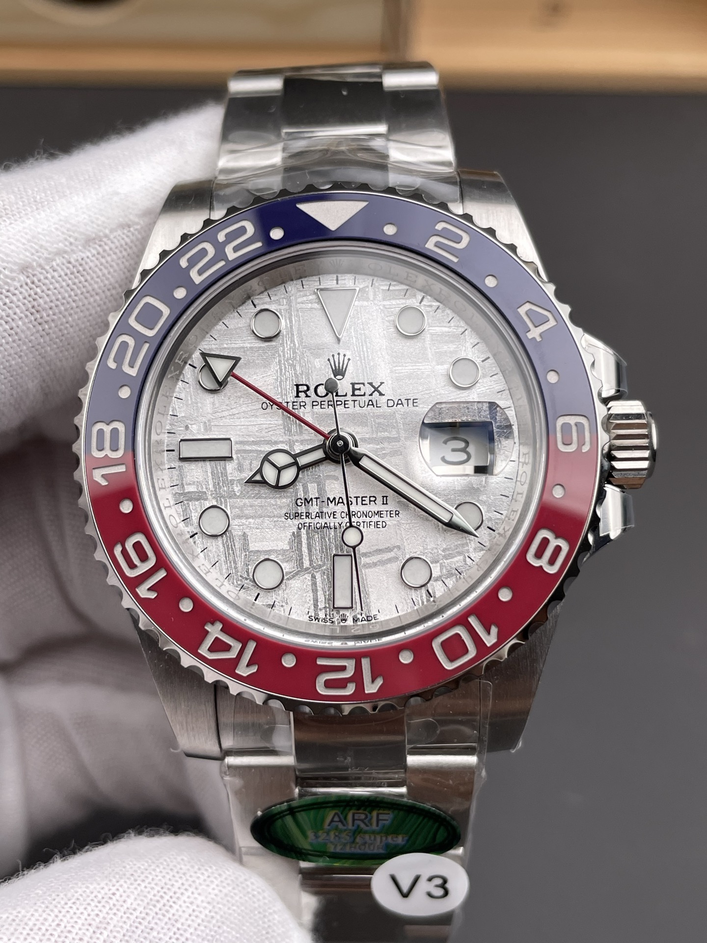 FRONT GLASS:Sapphire Crystal with etched crown at 6:00 position (With light AR on Cyclops like Genuine)