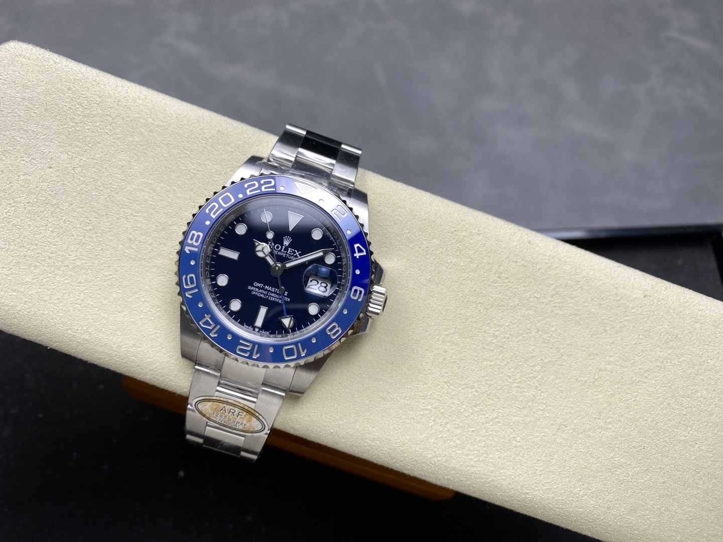 FRONT GLASS:Scratch-proof Sapphire Crystal with etched crown at 6:00 position (With light AR on Cyclops like Genuine)