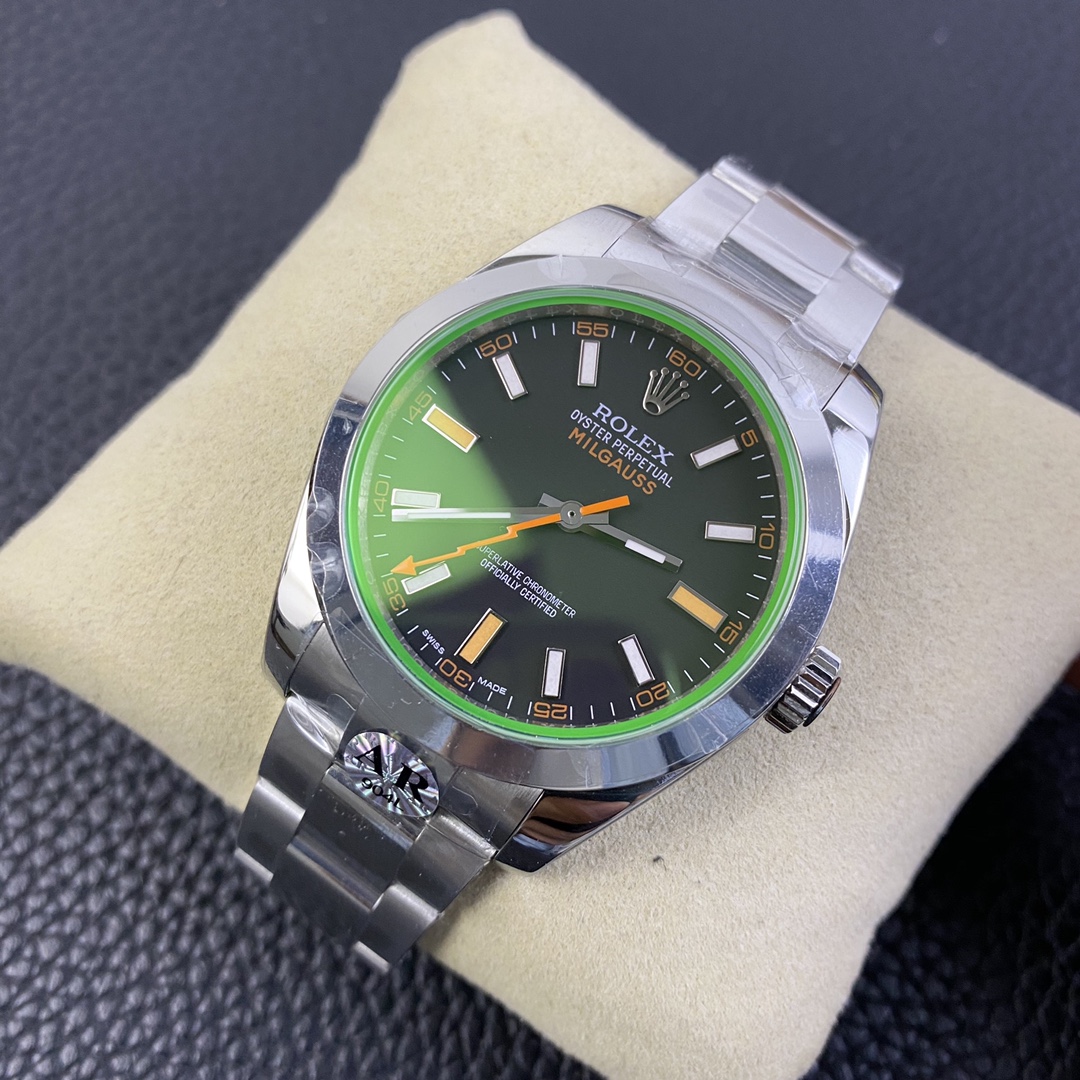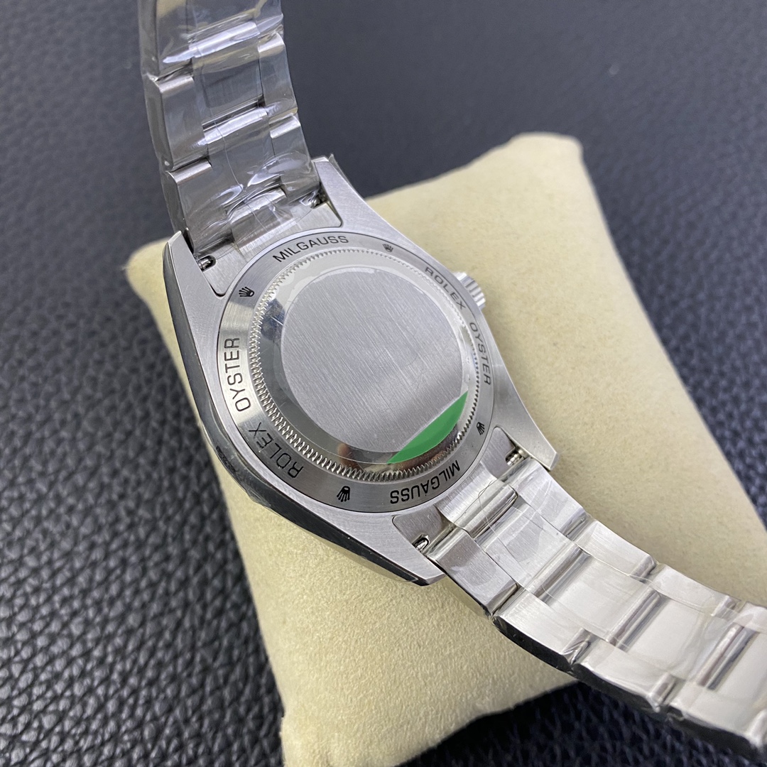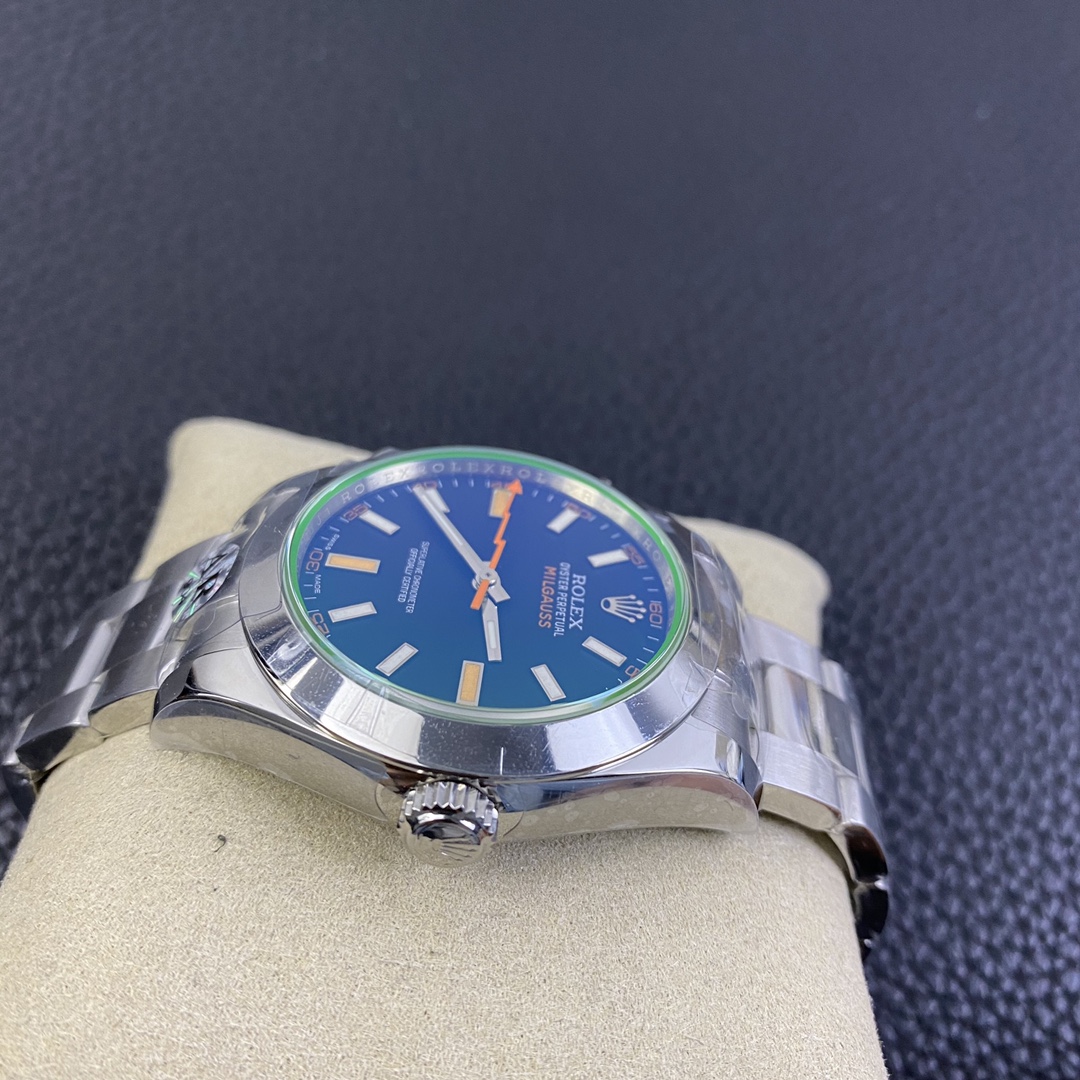 DIAL COLOR: New Milgauss Z Black Dial (Swiss Grade Superlume Blue on Broad Markers and Superlume Green on the other markers) – Dial has exact markings like Genuine even on the base plate (Vintage style Orange Lightning Hand)