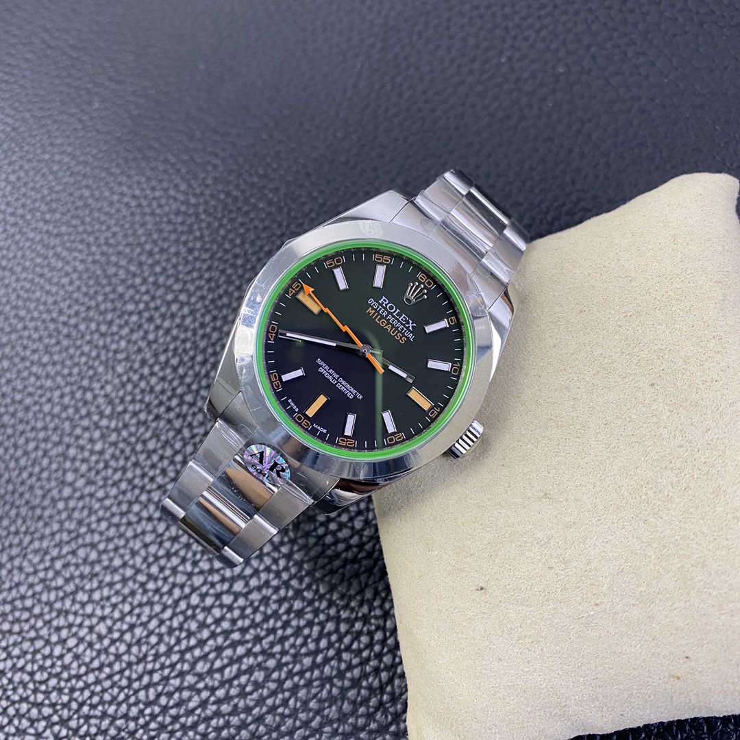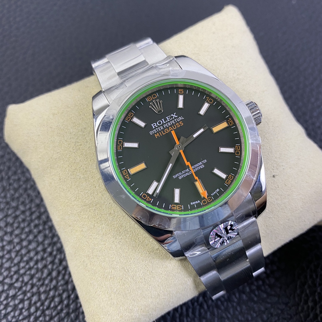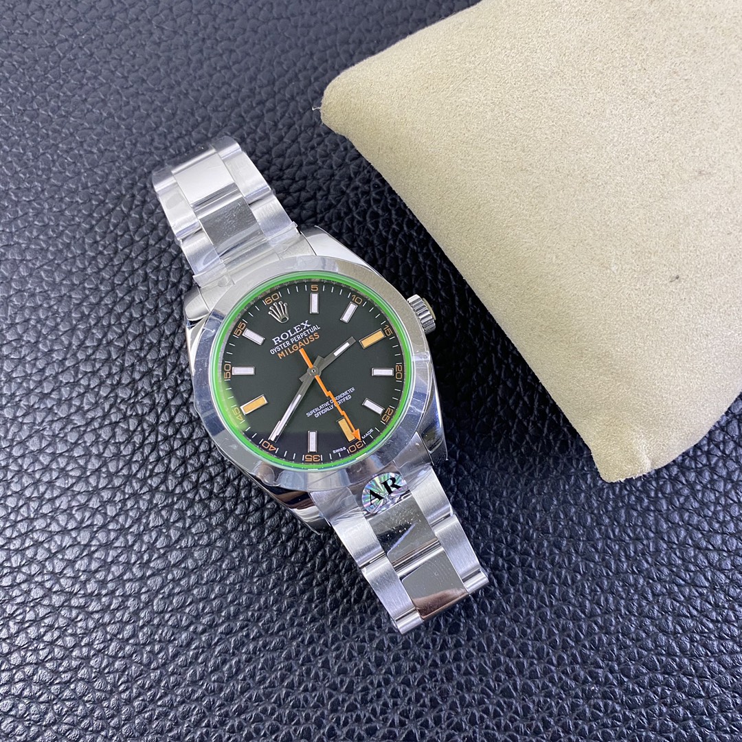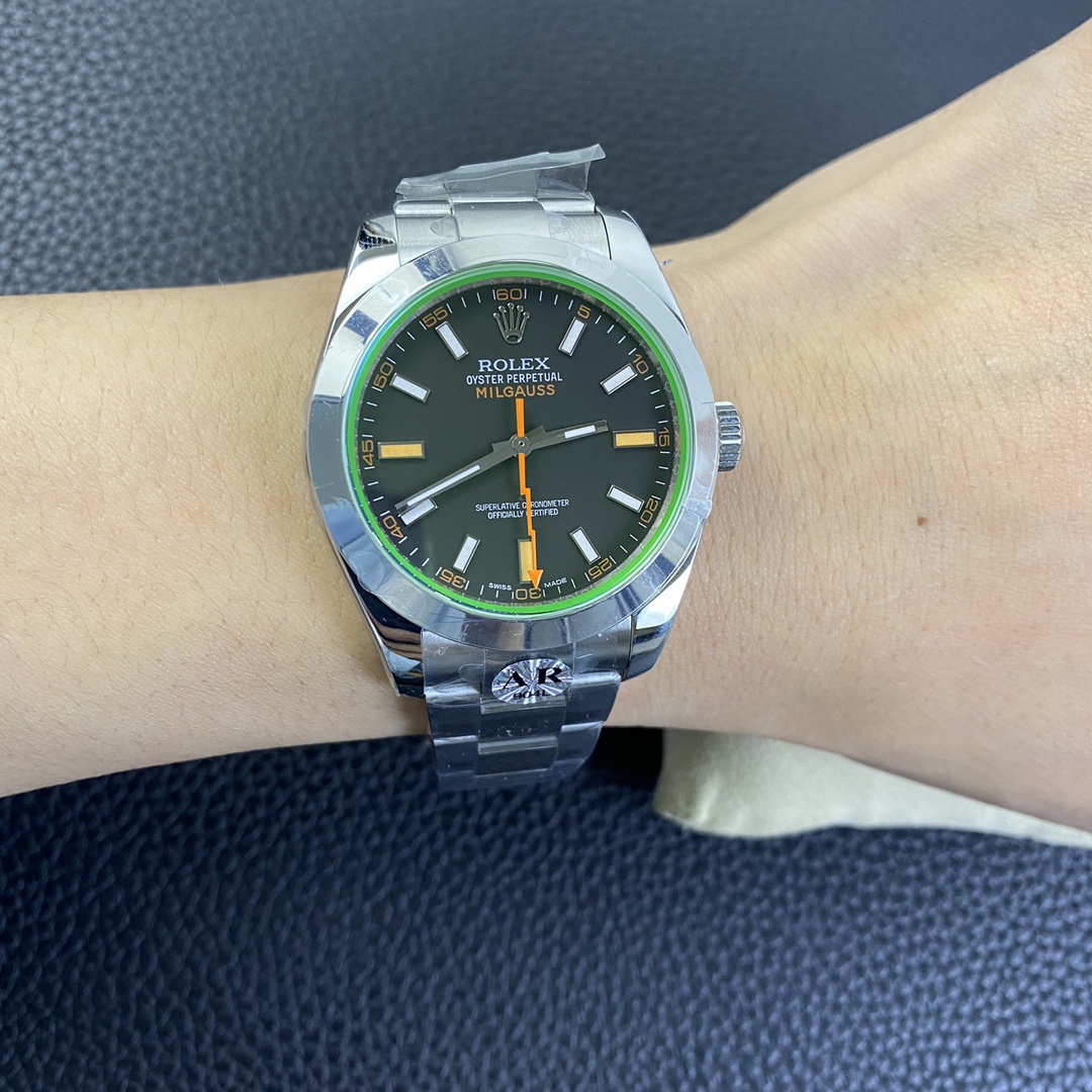 DIAL COLOR: New Milgauss Z Black Dial (Swiss Grade Superlume Blue on Broad Markers and Superlume Green on the other markers) – Dial has exact markings like Genuine even on the base plate (Vintage style Orange Lightning Hand)