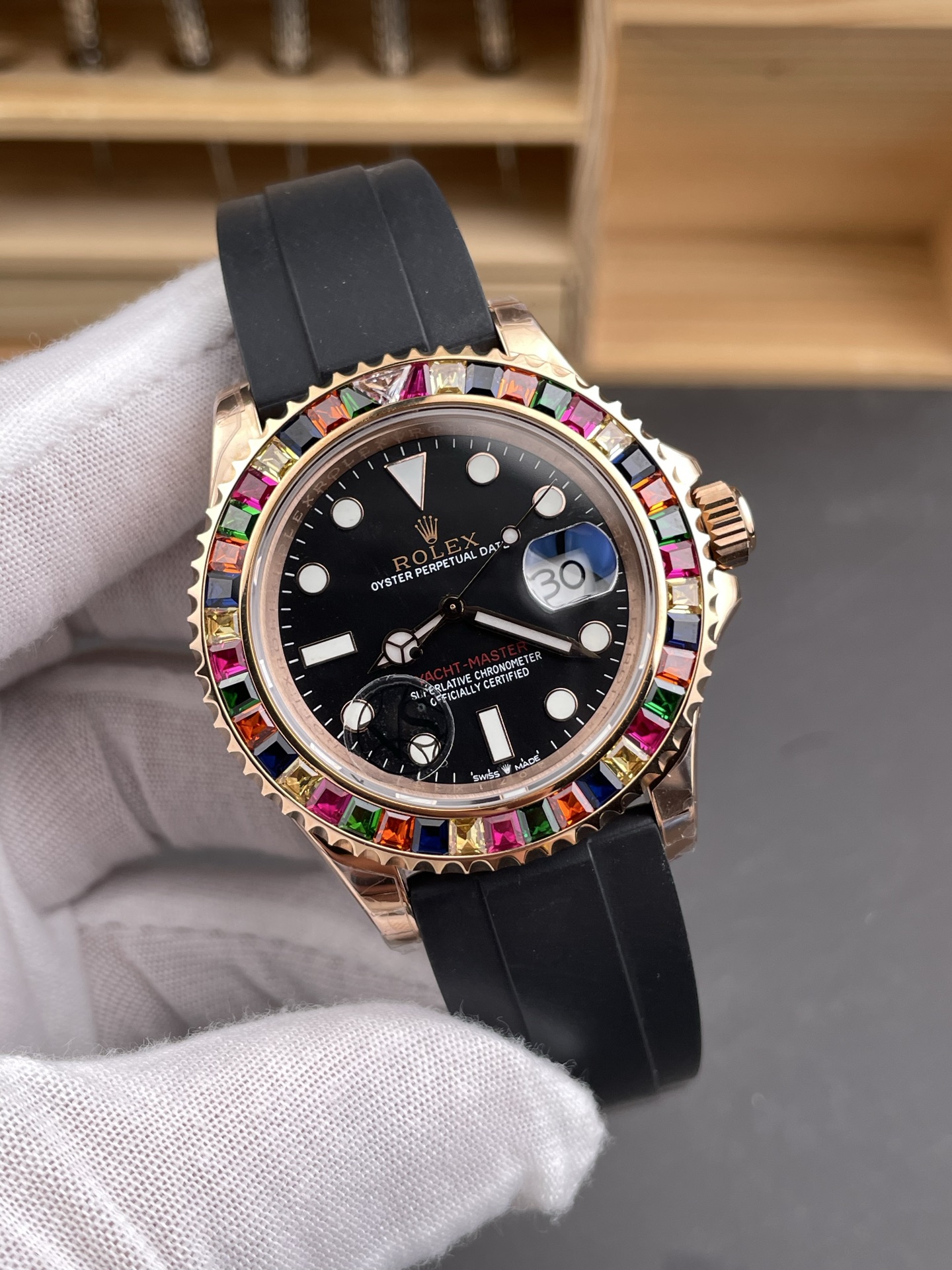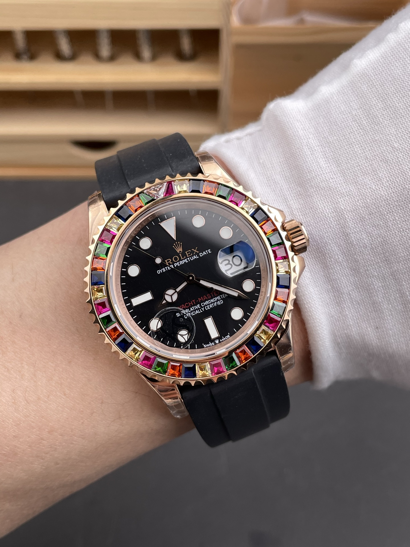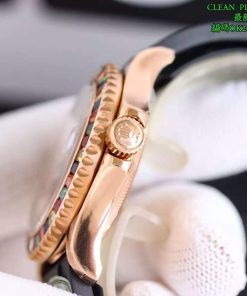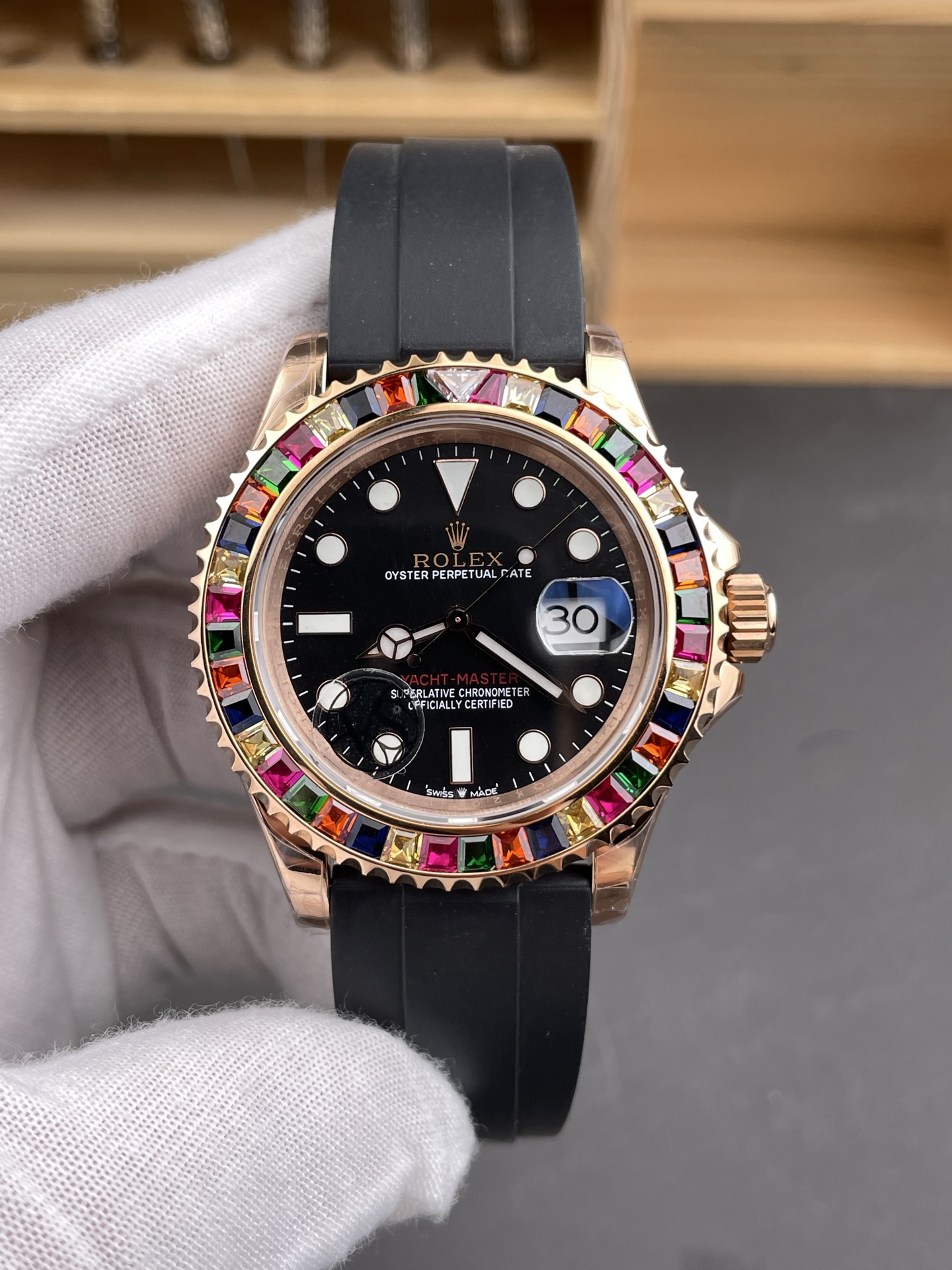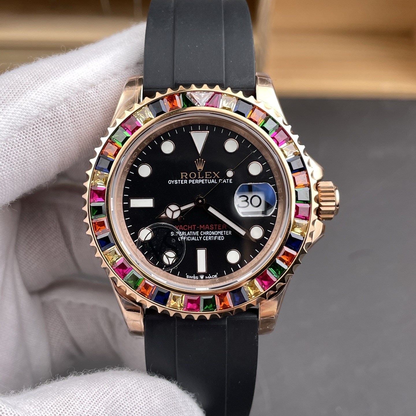 Rolex-Yacht-Master 116655 40mm Rainbow Diamonds Rose Gold/Rubber Black Dial Dot Markers VSF DD3235 Automatic