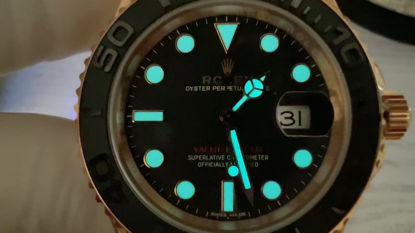 DIAL COLOR: Black Gold dial with dot markers with Blue Colored Superlume Applied on Markers and Needles